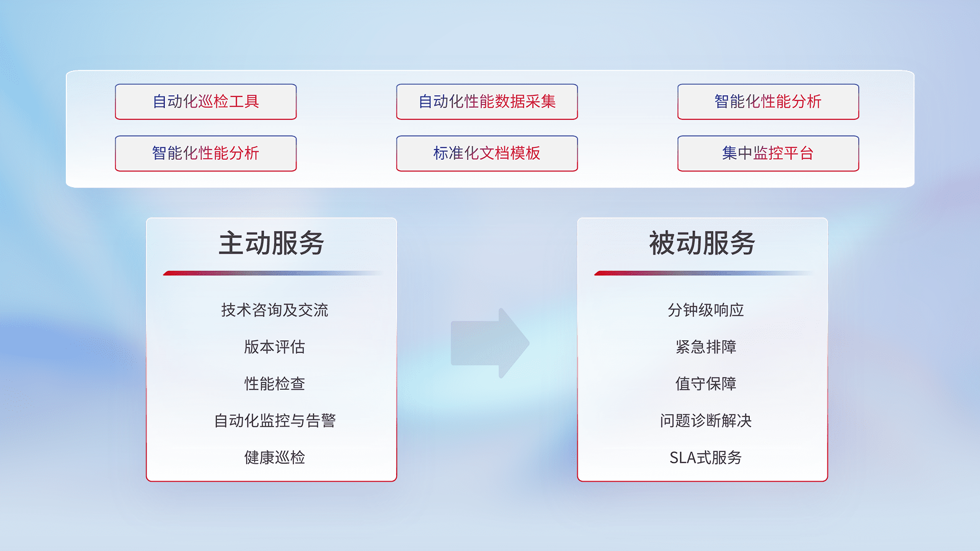 智能化工具和标准化文档,,保障服务质量,,提供主动服务(包含技术咨询、、版本评估、、、性能检查、、、、自动化监控与告警、、、、健康巡检)和被动服务包含(分钟级响应、、、、紧急排障、、、、值守保障、、、问题诊断解决、、SLA服务)。。。。